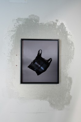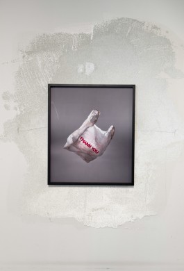 Dahingehend sehe ich meine Intervention als dreiteilig: Als wichtig betrachte ich meinen Vorschlag, Thomas Geiger könnte mit seiner Intervention (Skulptürchen 2015/16) die Türen geöffnet halten. Zweitens, löst meine Wandarbeit universal thoughts: wall 2017/2019 (reflektierende Glasperlen, Acrylbinder) im Vorbeilaufen einen in der Überforderung hilfreichen Orientierungsreflex aus – für gegenseitiges Verständnis ist dieser Moment der Reflexion ausschlaggebend. Drittens, ganz im Sinne der Sammellust entschied ich mich noch für zwei von insgesamt 293 Reproduktionen von Plastiksäcken – die Sammlung an Plastiksäcken wurde jahrzehntelang von meinen Eltern vorangetrieben. Ich vermute, dass sie in ihrer Gesamtheit eine relativ gute Abbildung der Antriebskräfte des europäischen Mittelstands darstellen. (#263 (Thank) und #264 (you) von 293 aus der Serie Bags 1986-2004 2019, Lambda-Prints).