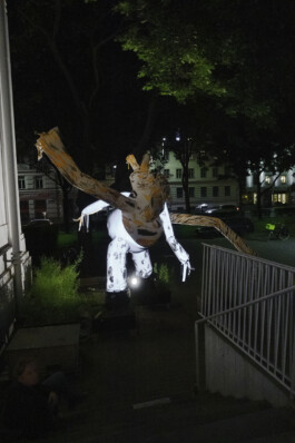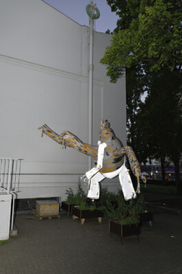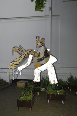 In Zusammenarbeit von Stefan Reiterer und Georg Petermichl entstand eine Skydancer-Skulptur, der sie den Namen Muli gegeben haben. Durch Luftzufuhr breitet sie sich überlebensgroß im Raum aus und beginnt zu tanzen. Genau wie die gleichnamigen Tiere ist Muli ein Hybrid. Skydancer sind eigentlich als Werbemittel im öffentlichen Raum bekannt. Durch ihre Größe und schnelle Bewegung sollen sie den Blick der Vorbeikommenden auffangen und so auf ein dahinterliegendes Geschäft aufmerksam machen. Gefertigt wurde die Skulptur in der Werkstatt des Modelabels Ferrari Zöchling aus getigertem und reflektierendem Material. Je nach Tageszeit verändert Muli sein Erscheinungsbild, im Tageslicht ist die getigerte Musterung zu sehen, die bei Dunkelheit verschwindet, sodass die Silhouette von den reflektierenden Teilen bestimmt wird. Juliana Lindenhofer wird ab 23 Uhr mit einem DJ Set den Raum, in dem Muli sich bewegt, auditiv gestalten. In ihrer künstlerischen Praxis adressiert Lindenhofer hybride Formen zwischen Mensch und Nicht-Mensch als Träger neuer Potenziale. (Josephine, Praktikantin Secession)